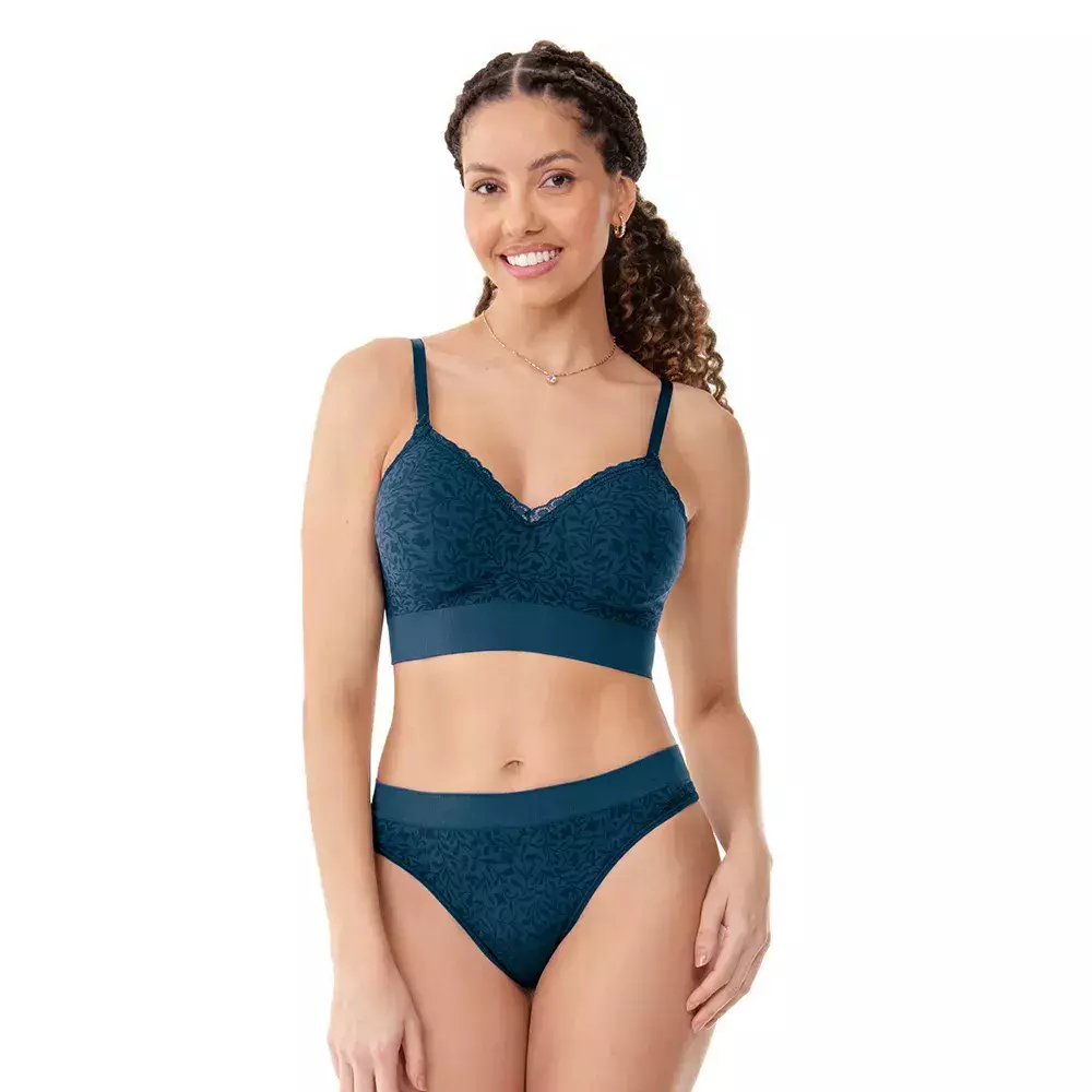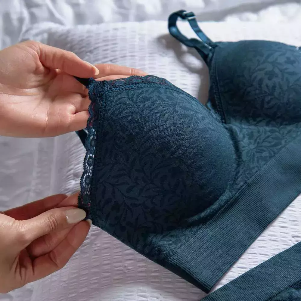 Conjunto composto por sutiã em jacquard com bojo macio (sem bolha e sem arco), duplo e com maior cobertura lateral, proporcionando conforto e segurança. A calcinha sem costura, também em jacquard, oferece um ajuste perfeito ao corpo.