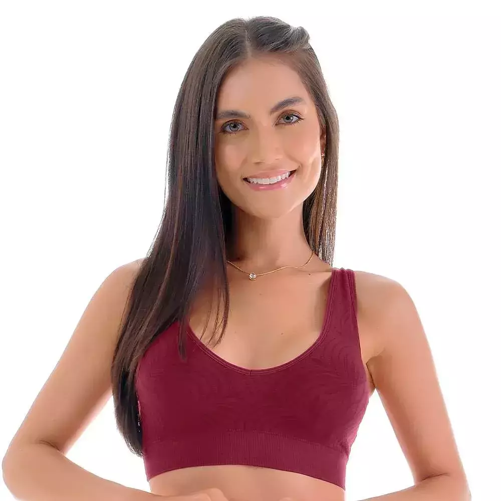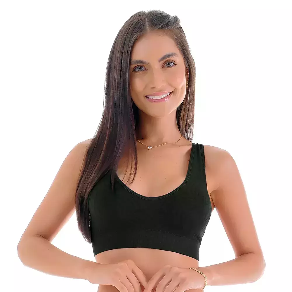 Top com bojo removível sem costura e alças mais largas com leve brilho e reguláveis, priorizando sempre o conforto durante o uso.